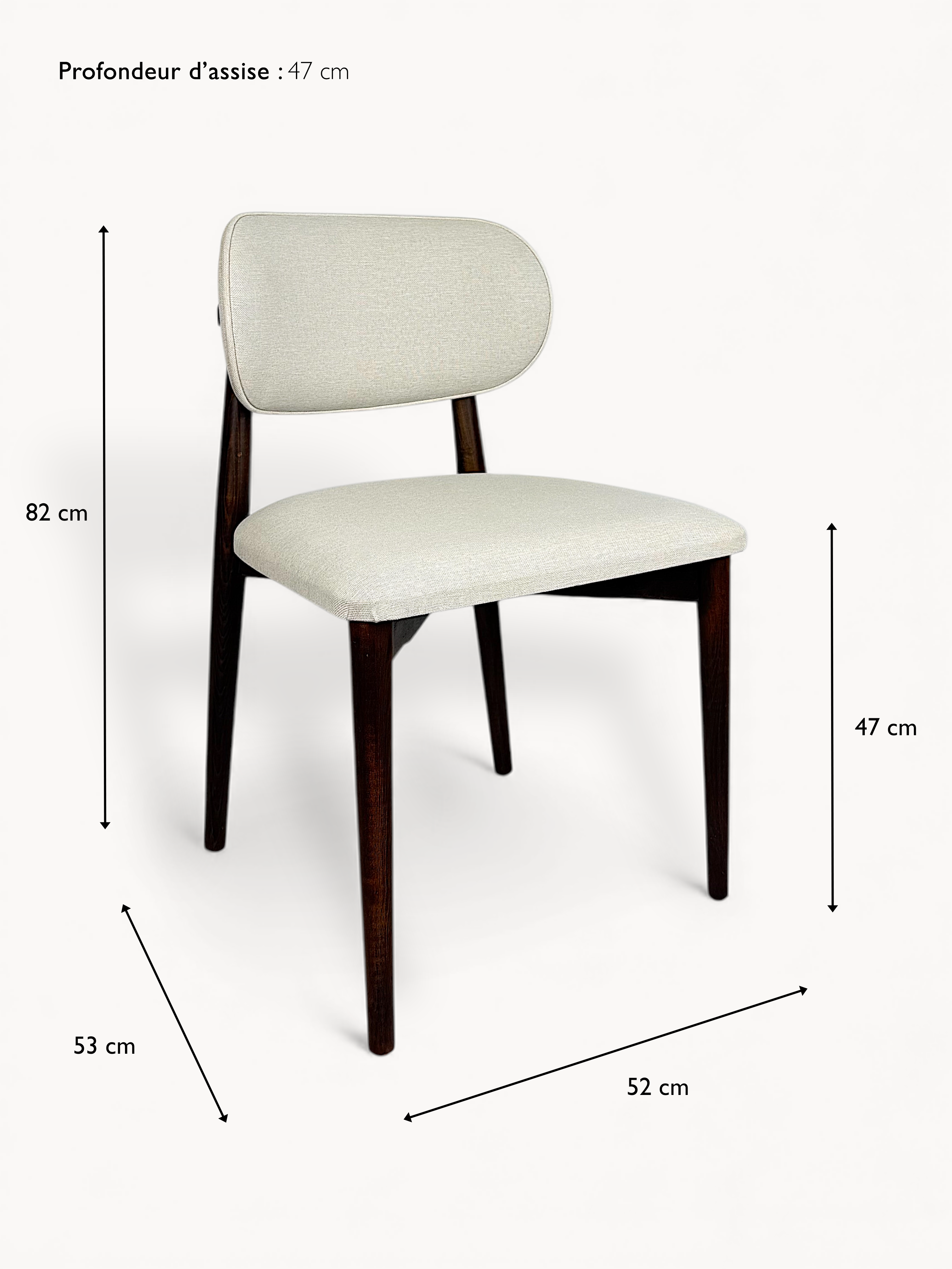 Fabriquée en bois massif, Eik met en valeur la richesse de sa matière. Le grain du bois, subtilement visible, dialogue avec la texture lisse de l’assise rembourrée pour créer un contraste délicat. Chaque pièce reflète un travail soigné, fidèle au savoir-faire artisanal cher à Noka.