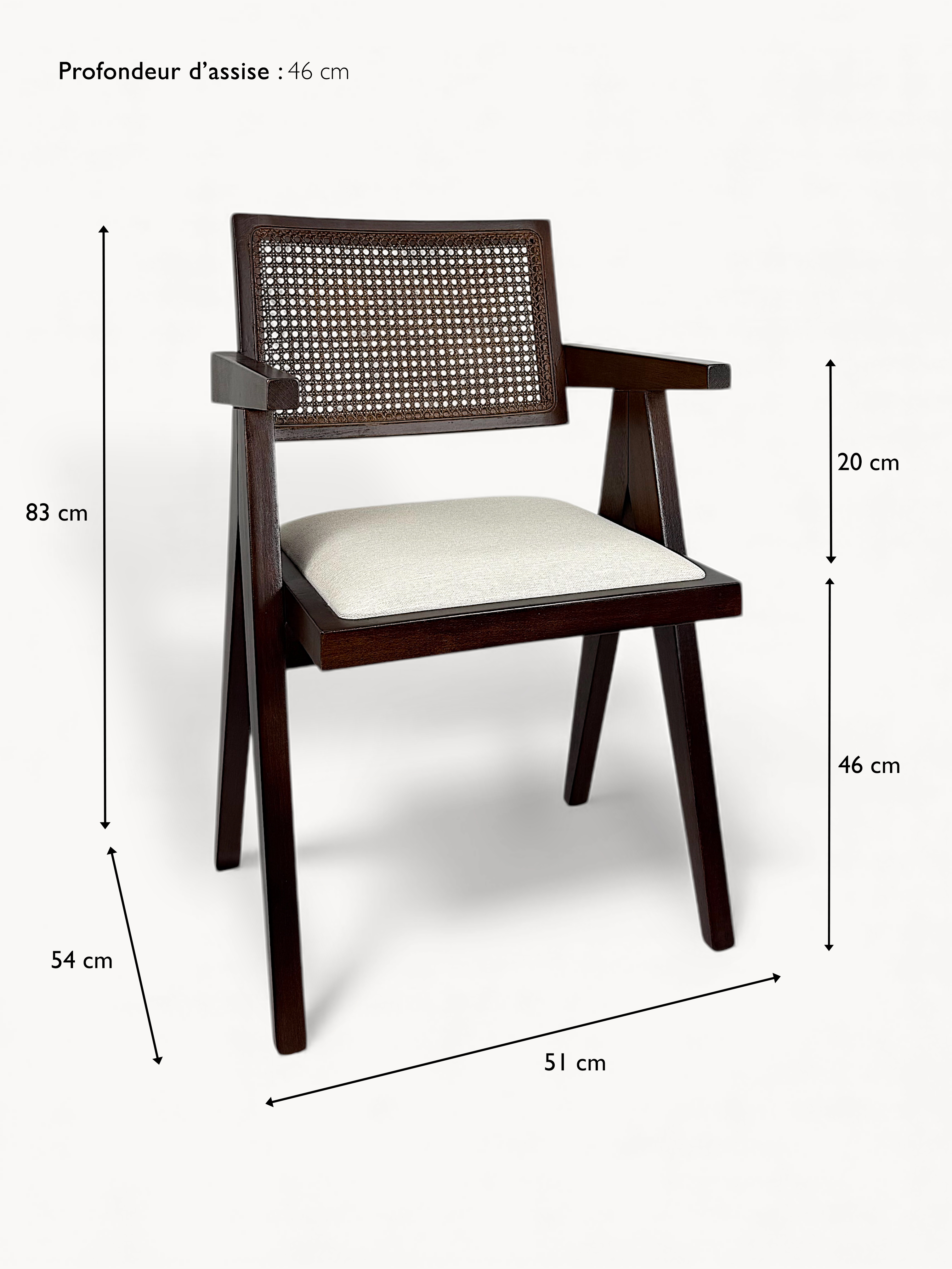 Fabriquée en bois massif, Fenja révèle la beauté du grain et la profondeur de sa teinte sombre. Son assise en tissu clair offre un contraste doux et équilibré, tandis que son cannage fin et ses finitions délicates témoignent d’un savoir-faire attentif. Chaque courbe et chaque angle sont pensés pour allier confort et justesse des proportions.