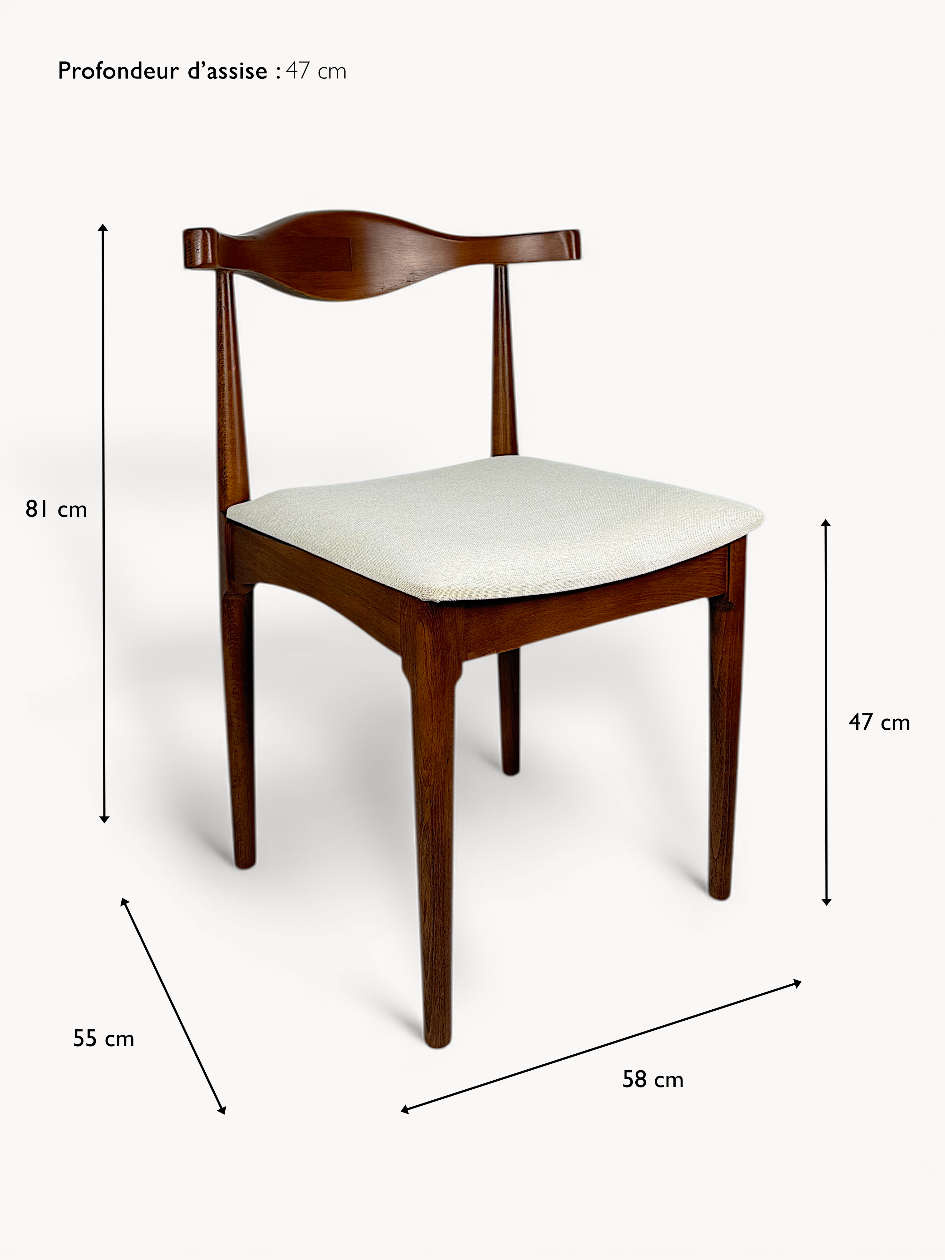 Fabriquée en bois massif dans une teinte noisette douce et chaleureuse, Järv met en valeur la texture et la noblesse du matériau. Son assise légèrement rembourrée, habillée d’un tissu clair, offre un confort subtil sans rompre la pureté du design. Chaque détail reflète un savoir-faire attentif et un respect sincère de la matière.