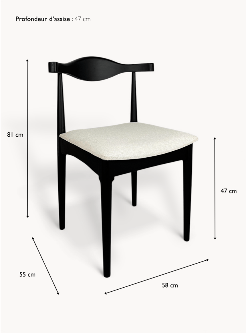Fabriquée en bois massif teinté noir, elle révèle la profondeur et la texture naturelle du matériau. L’assise légèrement rembourrée, habillée d’un tissu clair, ajoute une touche de confort discret, fidèle à l’élégance silencieuse du design japonais. Chaque détail reflète une recherche d’harmonie et de proportion.