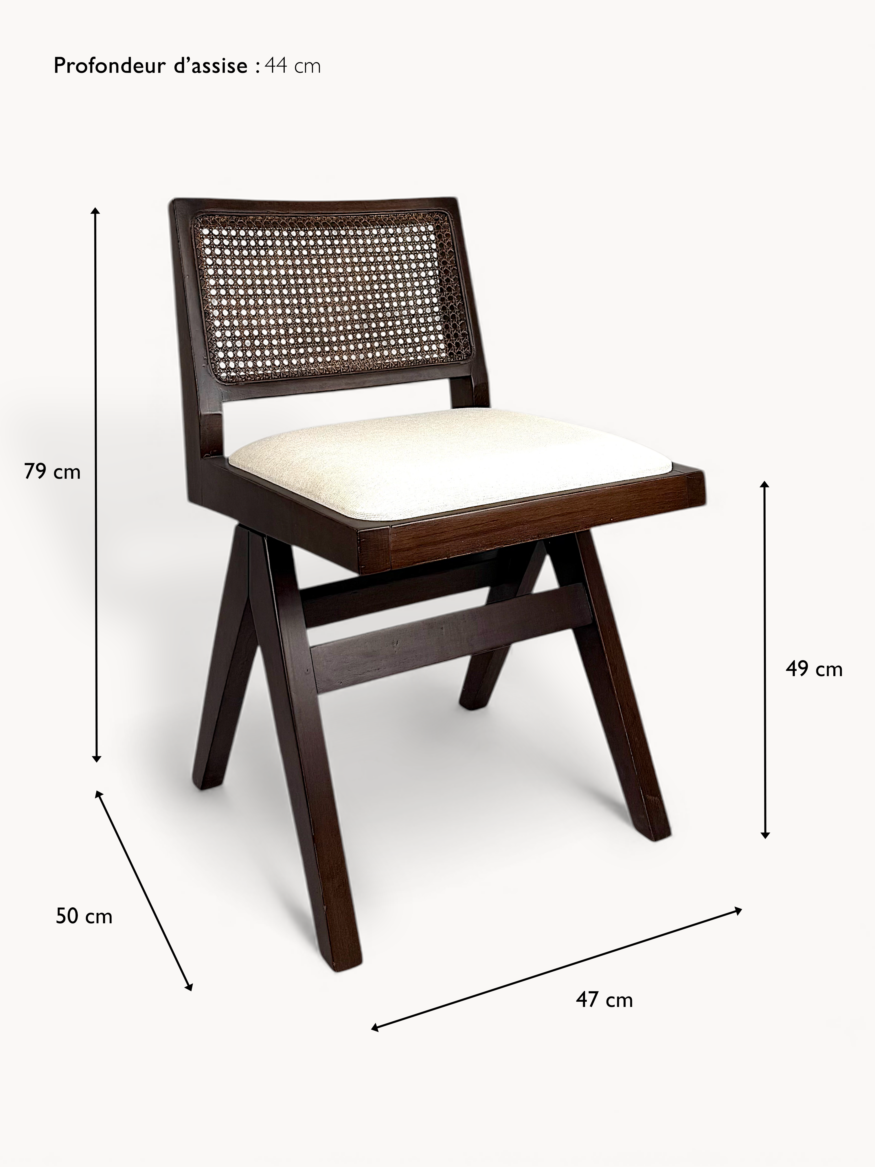 Fabriquée en bois massif, elle se distingue par un dossier en cannage artisanal qui allège visuellement la structure tout en laissant respirer la matière. Son assise, agrémentée d’un coussin clair, assure un confort discret sans rompre la pureté du dessin. Chaque courbe, chaque assemblage témoigne d’un savoir-faire attentif où la nature s’exprime avec justesse.