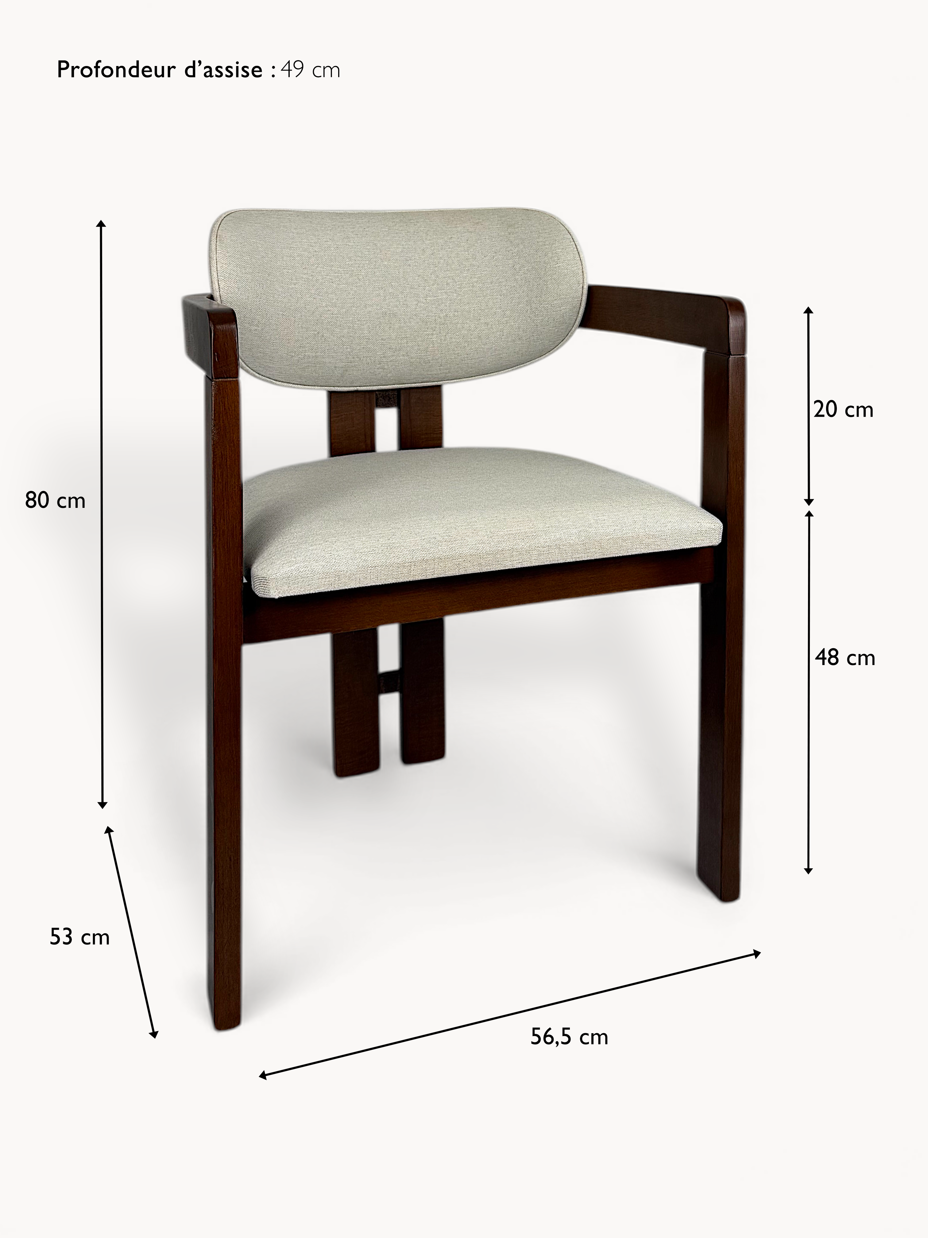 Conçue en bois massif teinte noisette, elle dévoile la texture vivante du matériau à travers un travail minutieux des surfaces. L’assise et le dossier, légèrement rembourrés, prolongent cette impression de confort feutré et d’harmonie. Chaque détail exprime le soin artisanal porté à sa conception.